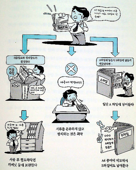 집이든 회사든 내 책상은 체계적인 정리가 필요하다. “주변이 어수선하면 무언가 해 보려고 해도 자신이 구제불능으로 여겨져 패배감”만 들 뿐이다. 그래서 이 책을 계기로 좀더 정리하며 살기로 했다. 왜 그렇게 어지르며 살았던 것인지 되돌아 봤다. 본시 언젠가는 쓰겠지 싶거나 희소가치 있는 정보라고 생각되면, 나와 전혀 관련이 없어도 보관하는 버릇이 있었다. 그런 사람을 가리켜 이 책은 말한다. “명품을 아무리 사도 만족하지 못하고 계속 사들이는 사람”과 같다고. 얼마나 정곡을 찌르는 말인가! 한 대 얻어맞은 듯하다. “오늘날과 같은 정보화 시대에 정말 중요한 능력은 정보를 많이 확보하는 것이 아니라 질적으로 뛰어난 정보를 구하는 능력”임이 틀림없다.책이 사람을 바꾸랴마는, 정말 그럴 수 있을 것만 같은 생각이 들었다. 이를 위하여 책에서 주는 몇 가지 교훈을 나의 원칙으로 삼고자 한다.