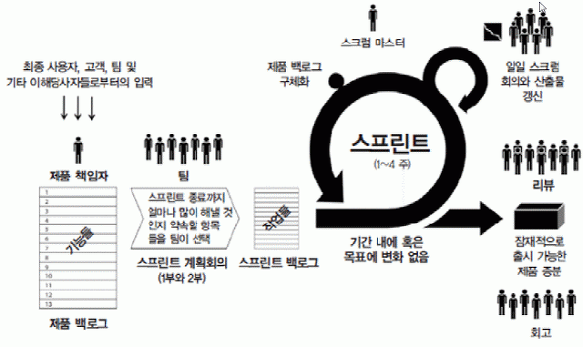 이런 국내 개발 환경에서 애자일 방법론으로, 스크럼이라는 것이 소개됐다. 제품 백로그라는 것을 통해 각종 요건사항들을 우선순위별로 관리하고, 한 달 기간 제품에 반영할 부분을 미리 영역을 지정하여 그 단위를 스프린트라고 명명한다. 이 스프린트 백로그를 완성하기 위해 전담팀을 구성하는데, 스크럼이라고 부른다. 이 팀에는 스크럼 마스터가 존재하고, 스크럼의 규칙선언과 대담한 결정 권한이 위임된다고 보면된다. 매일 스크럼회의를 하게되는데, 15분정도 소요되는 간단한 회의임에도 할일,한일,문제점 등을 나누게한다. 외부의 모든 요건에 대한 사항은 스크럼 마스터와 상의해야 하며, 스크럼 팀 내의 개발환경은 철저히 보호되도록 한다. 즉, 스크럼팀은 스프린트 백로그를 철저히 완수하기 위해 몰입하는 환경이 구성된 셈이다. 스프린트가 진행중일 때 추가되는 요건은 스크럼 마스터와 제품 관리자와 상의하고 우선순위를 고려하여 다음 스프린트에 추가할지를 결정하면 된다.