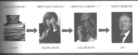 프로젝트 관리자에게 가장 중요한 목표는 ‘일정 내에 안전하게 프로젝트 목표에 도달하기’다. 정확한 보고서는 목표를 달성하는 수단에 불과하다. 결코 목표 자체가 아니다. (p.214)