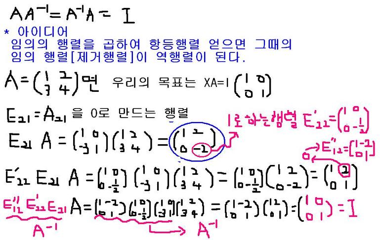 행렬의 곱을 이용해 풀었지만 좀 더 쉽게 구할수 없을까를 궁리해본다면, 다음 수순은 필연적으로 역행렬이 될것이다. 실수에 대해 곱셈을 정의한후 나눗셈을 정의하듯이, 행렬계산을 쉽고 빠르게 할려면 나눗셈연산인 역행렬 정의가 필요해진다.