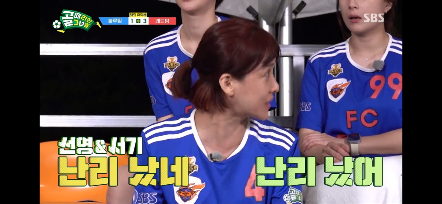 박선영과 서기의 조합이 빛을 발했다. 특히나 기회가 오면 과감히 골문을 향해 슛을 때렸기에 3점이나 얻을 수 있지 않았나 싶다. 그런데 처음부터 블루팀에게는 좀 불리한 조합이었다. 한쪽이 박선영, 서기였다라면, 반대편은 이정은, 경서라야 하지 않았나 싶고, 골키퍼도 그렇다. 아무리 아이린이 잘한다지만, 아유미의 선방에는 미치지 못하는 것 같다. 그러니 박선영, 서기, 아유미의 조합이 어디 일부러 이기라고 한 게 아니고서야 가당키나 한 거였냐는 거다.