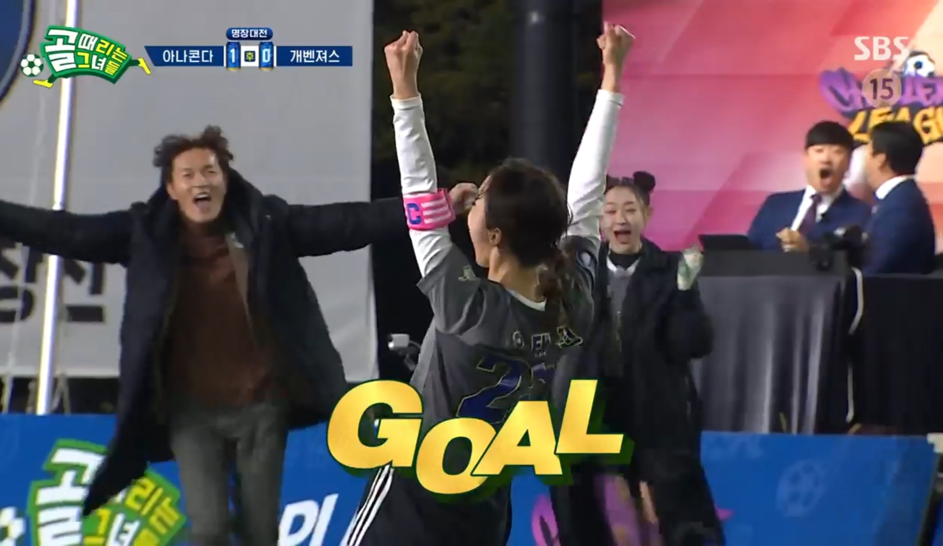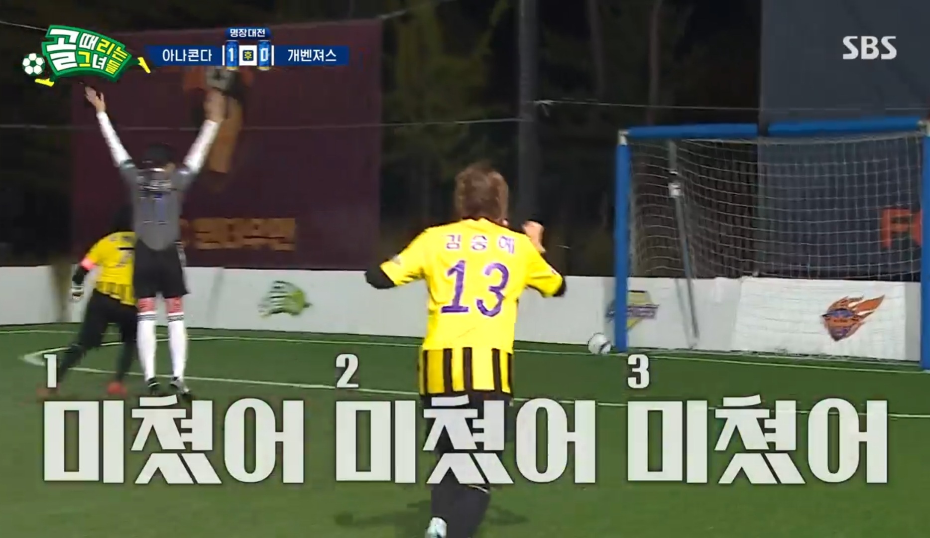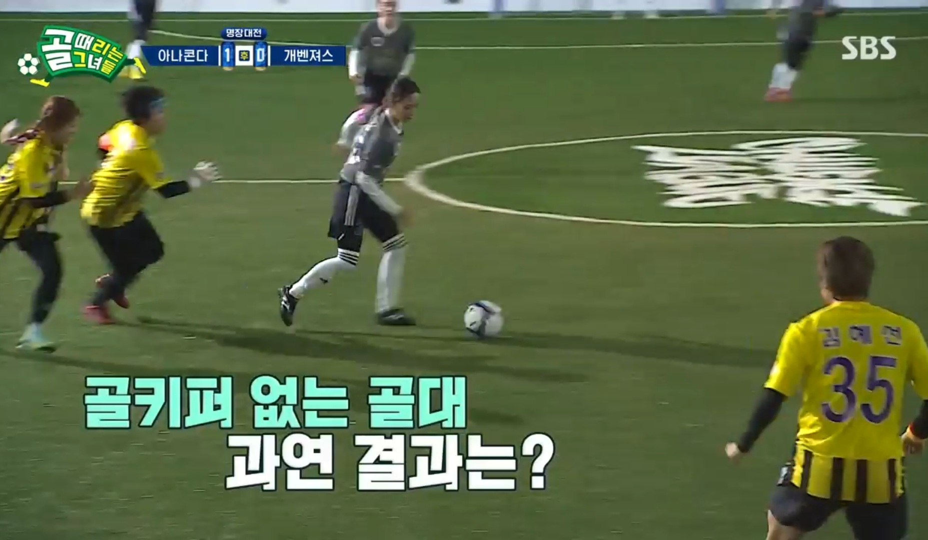 0:0의 기나긴 균형은 후반 3분을 남겨놓고 터쳤다. fc개벤져스의 주장, 조혜련의 실수였다. 조혜련이 킥을 하려고 볼을 굴리는 것을보고 노윤주가 달려나왔다. 사전에 조재진 감독과 이 부분에 대해 연습을 꽤나 했던 것 같다. 흘러나온 볼이 노선수의 무릎에 빚맞았는데, 정확히 골대로 빨려들어갔다.
