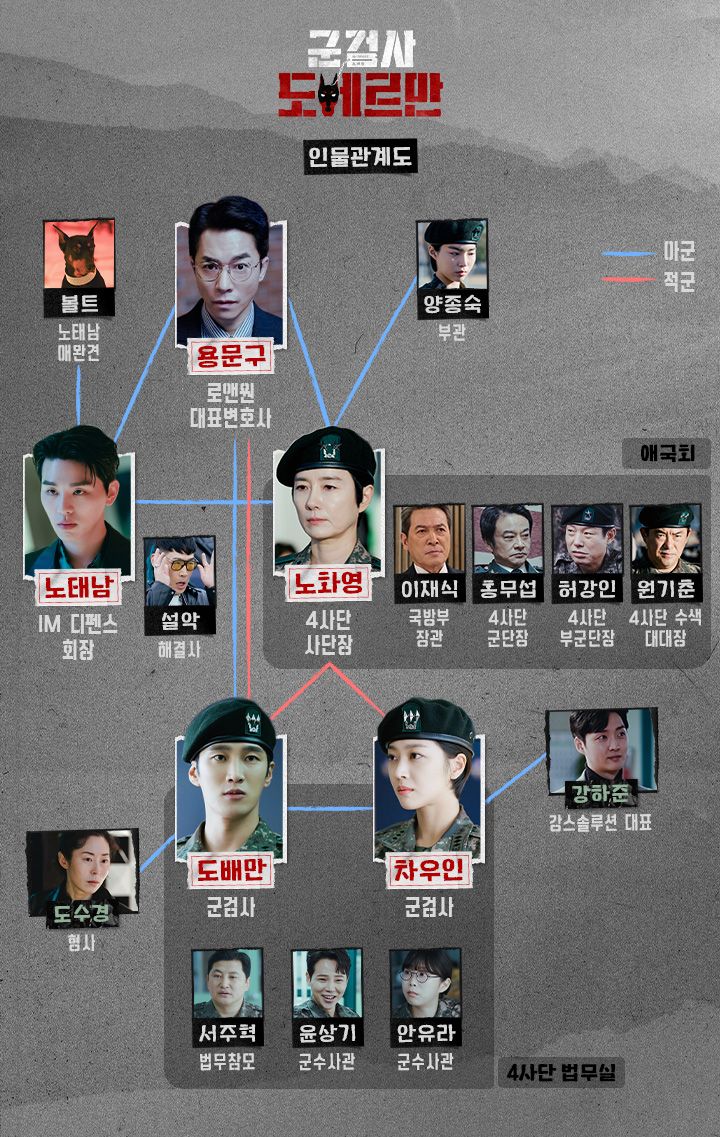 [군검사 도베르만]은 군사법원을 메인 무대로 다룬 보기드문 드라마다. tvN에서 22년 2월부터 방영했으며, 월화 드라마 사상 3위에 해당하는 시청률을 기록했다. 넷플릭스 오리지날 <DP>가 사병 위주의 탈영을 주로 다루고 있다면, 이 드라마는 방위사업체와 군수내부 간의 비리를 다루고 있다. 물론 군법정에서 관사의 갑질논란이나 총기난사사건와 같은 사회적 이슈도 다루고 있지만, 전체적인 흐름에 꼭 필요했던 것인지는 의문이다.