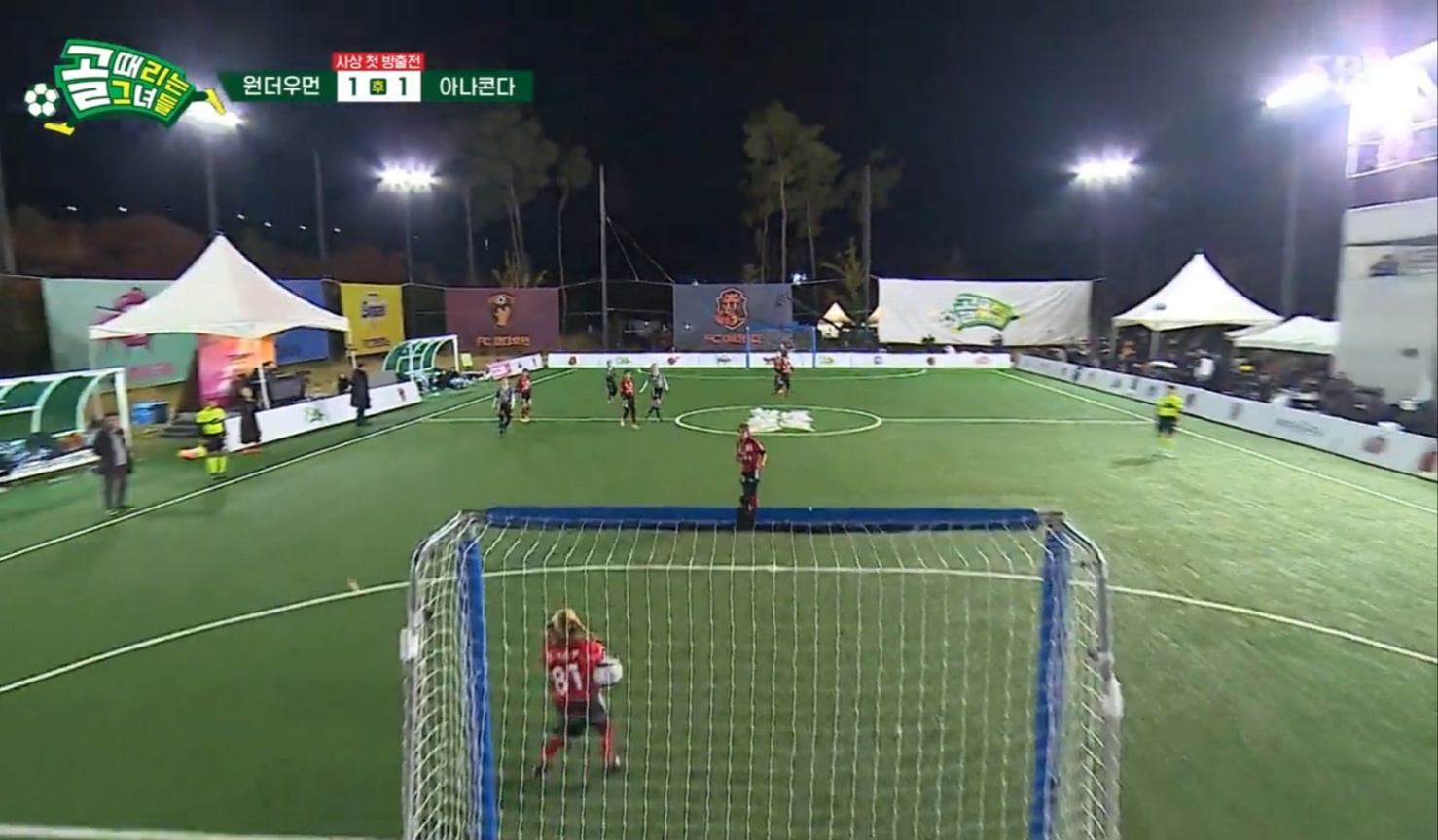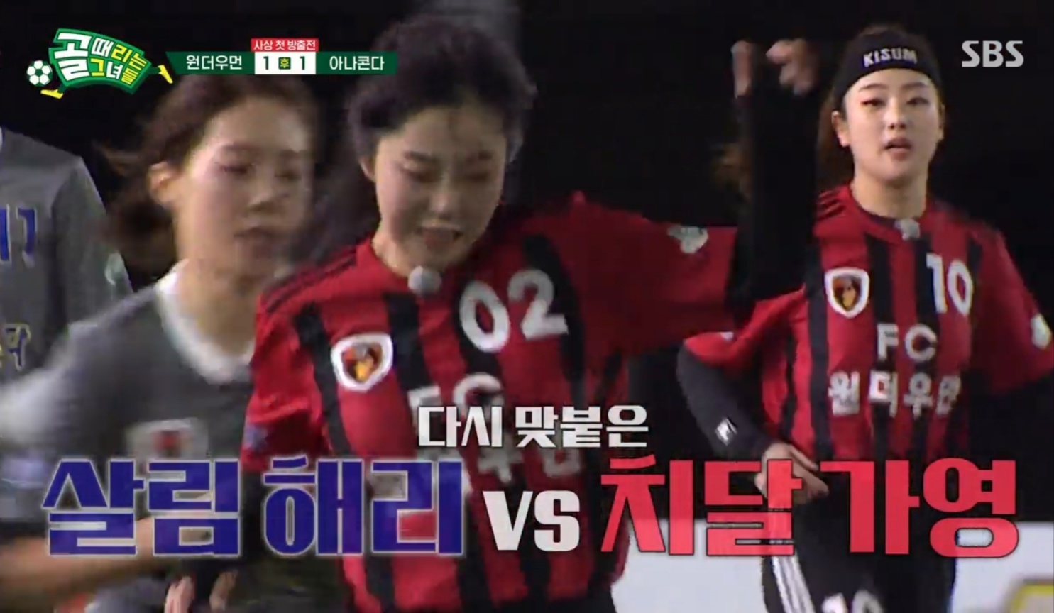 경기는 초반부터 원더우먼이 세트피스로 키썸이 1골을 넣고 시작하는 유리한 기세였으나, 점자로 아나콘다의 예리한 패싱과 슈팅 감각으로 원더우먼의 골문을 두들겼다. 그러나 그렇게 많은 골들이 유효슛만 기록한 채로 사실상 요니P의 선방에 모두 막히는 불운이 안겼을 뿐이었다. 팽팽한 긴장이 오가며, 선수들의 부상이 속출하고 전반전은 끝났다. 원더우먼은 주시은의 부상으로 후반을 오로지 교체없이 5명만 뛰어야 하는 상황이 연출됐다. 슈퍼우면의 결의도 그 어느때 보다 남달랐다.